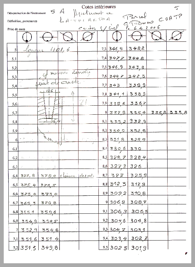 Résumé : Relevé des cotes intérieures du graile 5A. Présence d'un schéma manuscrit du puit d'anche.